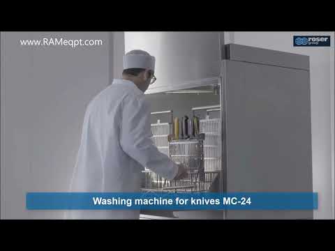 The Roser Model MC24 Knife-Holder Cleaning Machine is designed exclusively for washing knives in knife holders and guarantees the correct level of hygiene. The Roser Model MC24 Knife-Holder Cleaning Machine is highly recommended for all industries in the food sector and was designed taking into account the basic concepts of hygiene and safety.The Roser Model MC24 Knife-Holder Cleaning Machine mainly consists of a stainless steel tank chamber that is sealed via a hinged door. Inside the chamber features a water spray system driven by a centrifugal pump through appropriate pipes. The Roser Model MC24 Knife-Holder Cleaning Machine's control panel includes stop-and-start buttons, cycle start, wash time selector (cycles available 2 minutes, 4 minutes or 6 minutes), and wash water and rinse water temperature